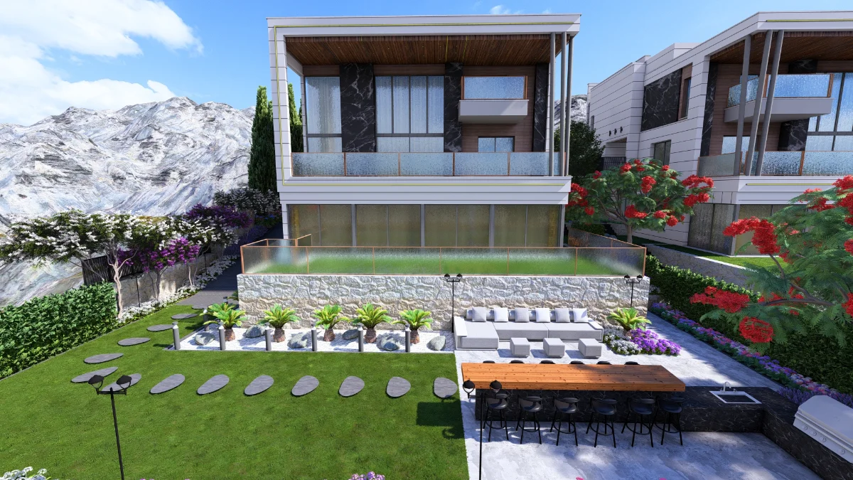 תכנון יוקרתי לשטח מורכב עם הפרשי גובה משמעותיים, היוצר חיבור הרמוני בין שתי קומות הבית ושתי הכניסות.