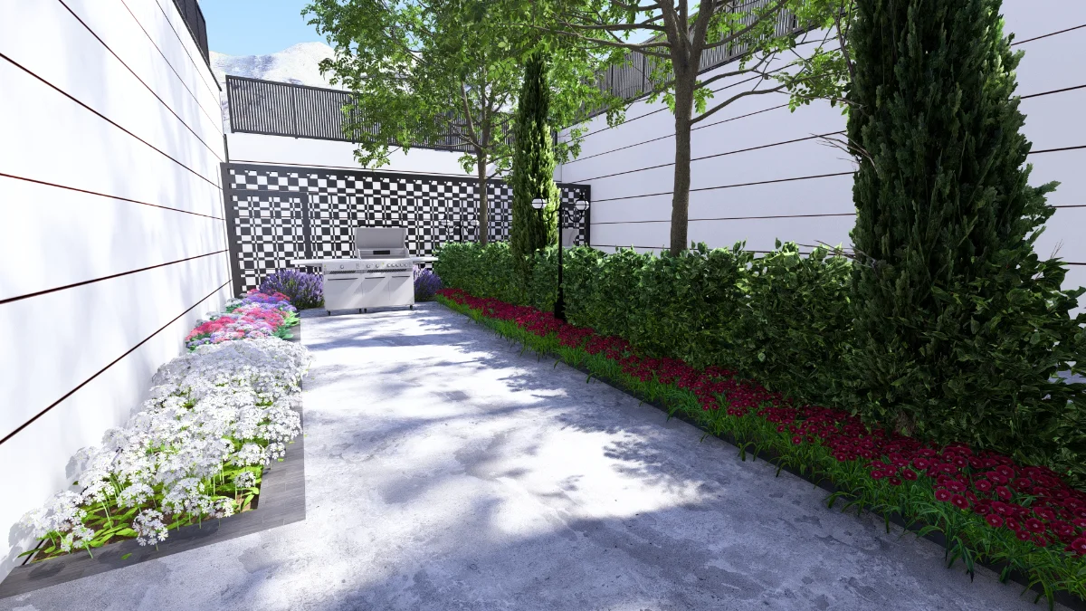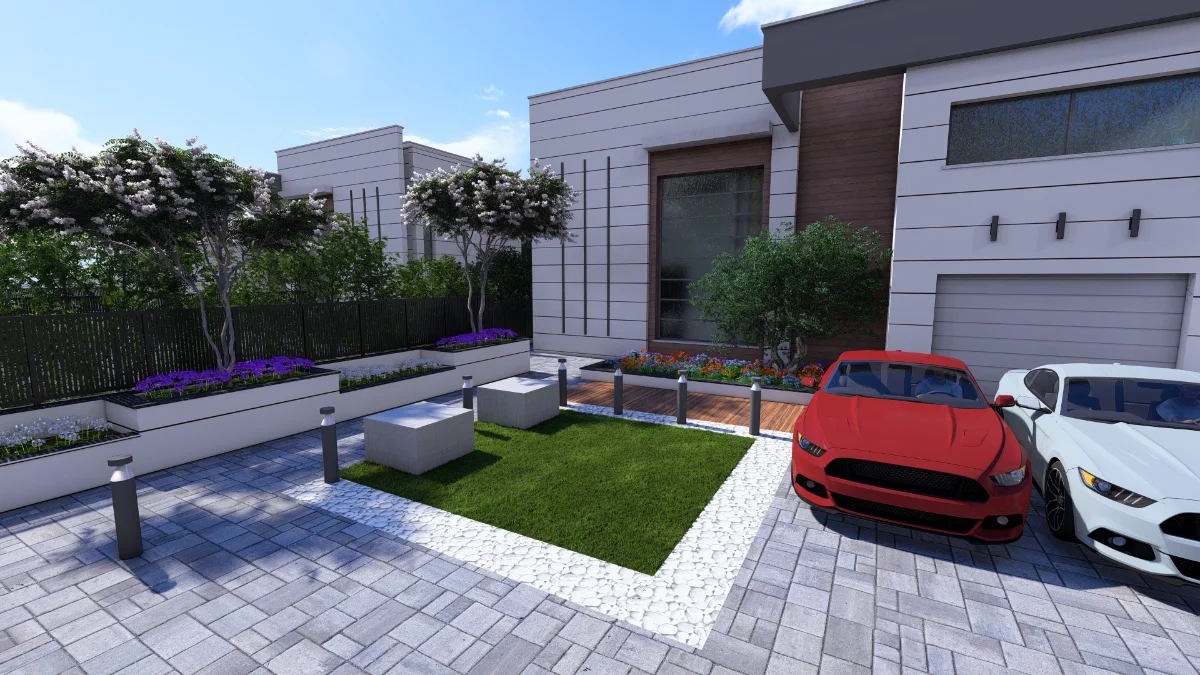 הגן משלב צמחייה נמוכה ומדויקת לשמירה על נוף פתוח, לצד חומרים איכותיים ופלטת צבעים המשתלבת עם אדריכלות המבנה.